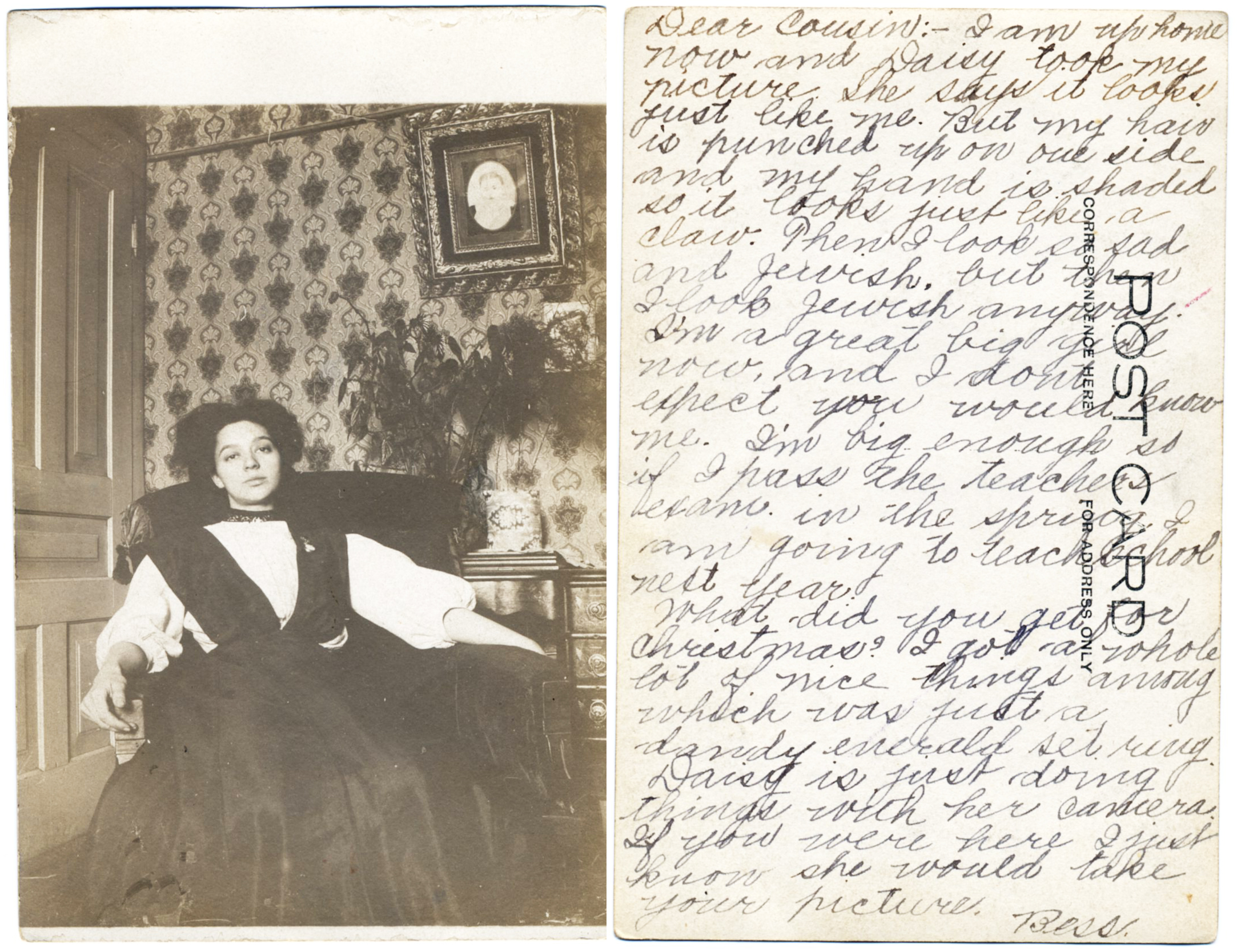 Dear Cousin:- I am up home now and Daisy took my picture. She says it looks just like me. But my hair is punched up on one side and my hand is shaded so it looks just like a claw. Then I look so sad and Jewish, but I look Jewish anyway. I’m a great big girl now and I don’t expect you would know me. I’m big enough so if I pass the teachers exam in the spring I am going to teach school next year.