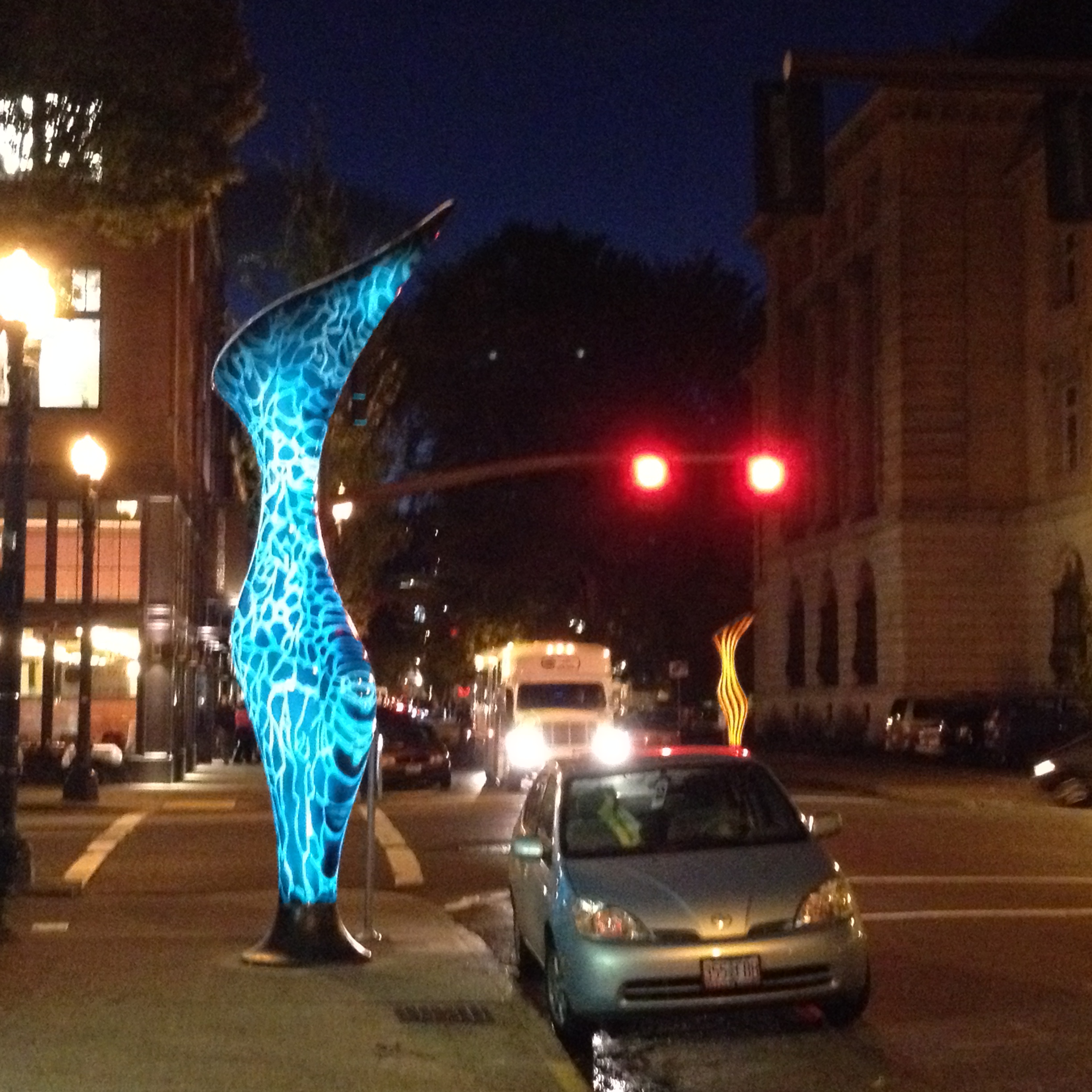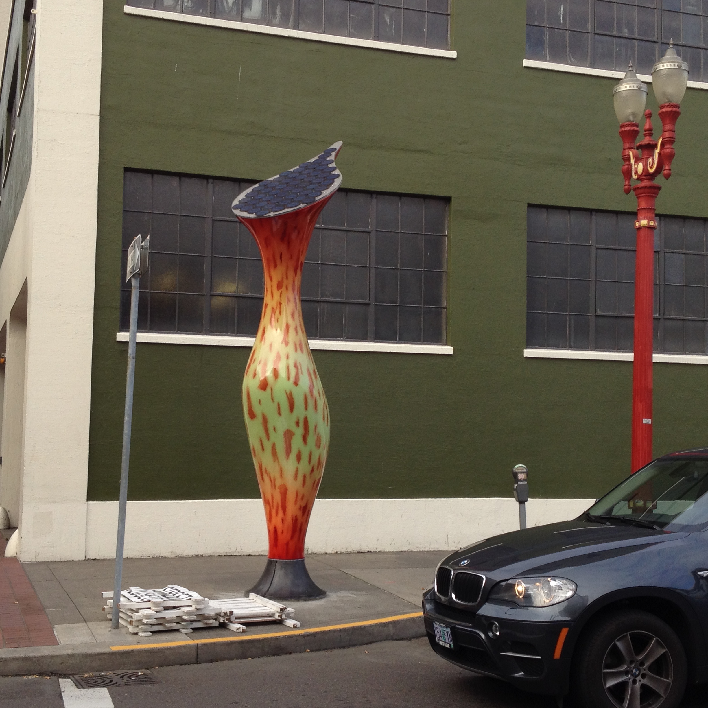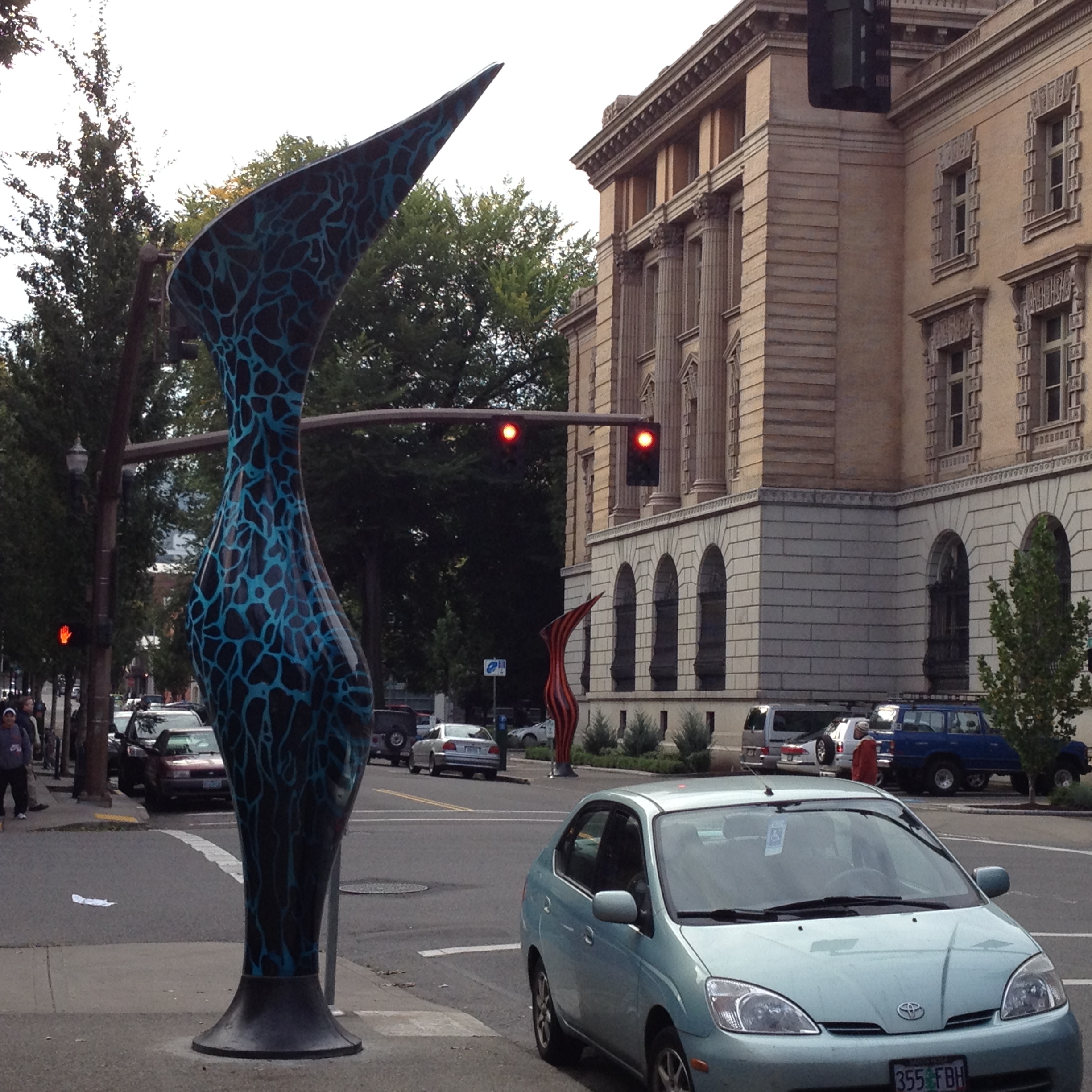 SOOOOO…My thinking is that the context is wrong. They do not live well on the sidewalk, especially in the muddle of Pearl/Chinatown. They would do much better in a plaza or garden. They need space and now they are inhibited by signposts, street lamps and parked cars. All of those things inhibit seeing the work clearly in the same way that static inhibits hearing music on the radio.