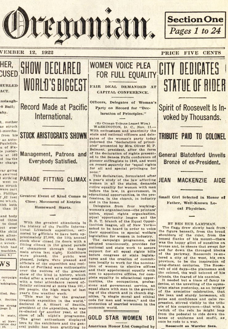 On July 16, 2000 The Oregonian published a reprint of page one from Armistice Day 1922 with the statue dedication noted in the right hand column.