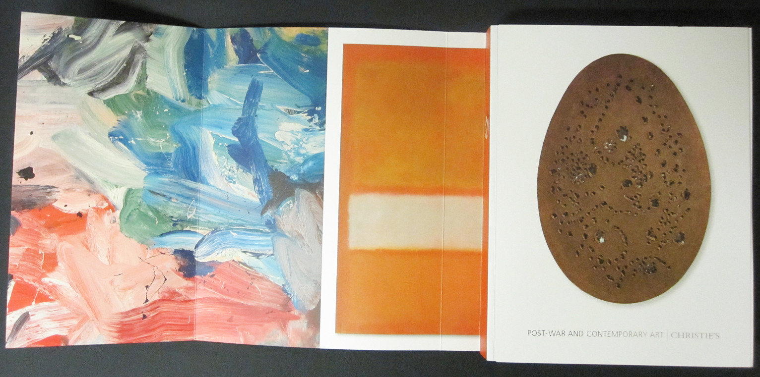 And a Roy Lichtenstein (Seductive Girl, 1996, estimate $22-28 million) on the flyleaf. But wait! Here’s the book cover with Lucio Fontana’s Concetto spatziale, La fine di Dio, 1963 (est. $15-20 million). And inside the dust jacket, De Kooning, Untitled VIII, 1977 (est. 20-30 million), and Rothko, No. 11 (Untitled), 1957 (est. $25-35 million).