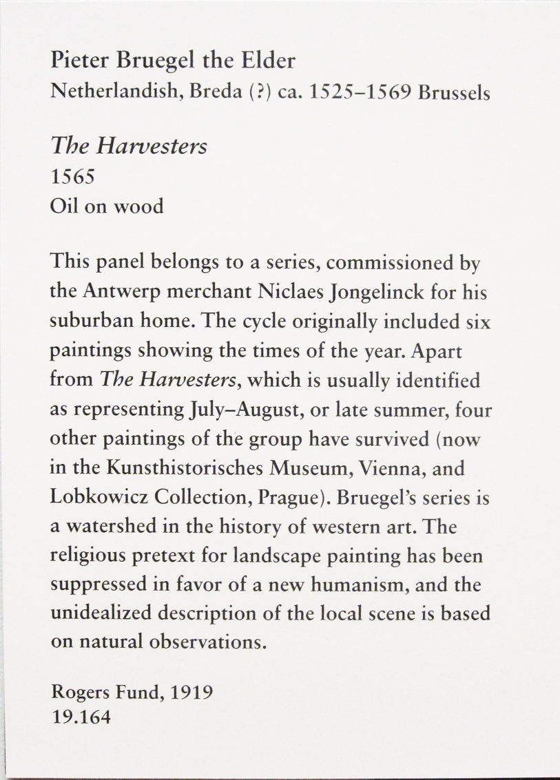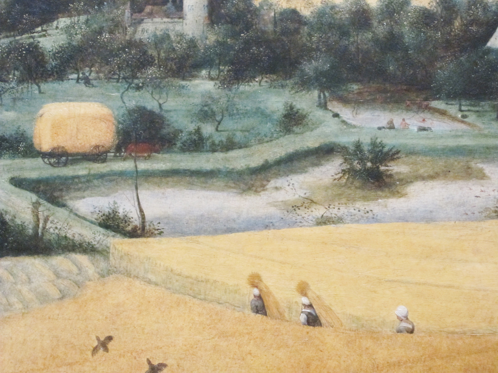 I remember The Harvesters by Peter Bruegel from a projected slide in the first-year art history class I took decades ago. Recently I viewed the original again at the Metropolitan Museum in New york.