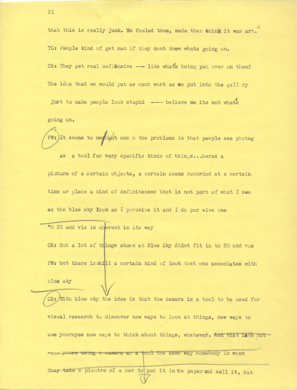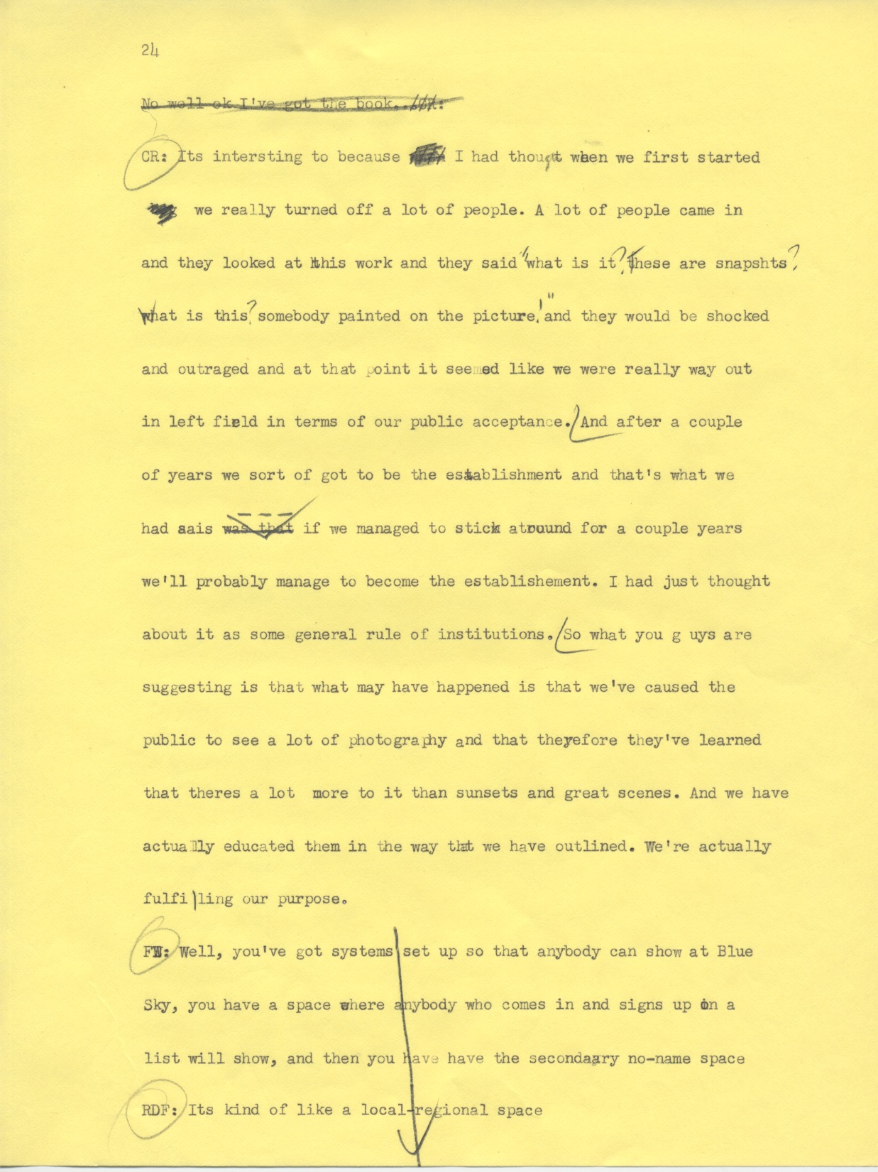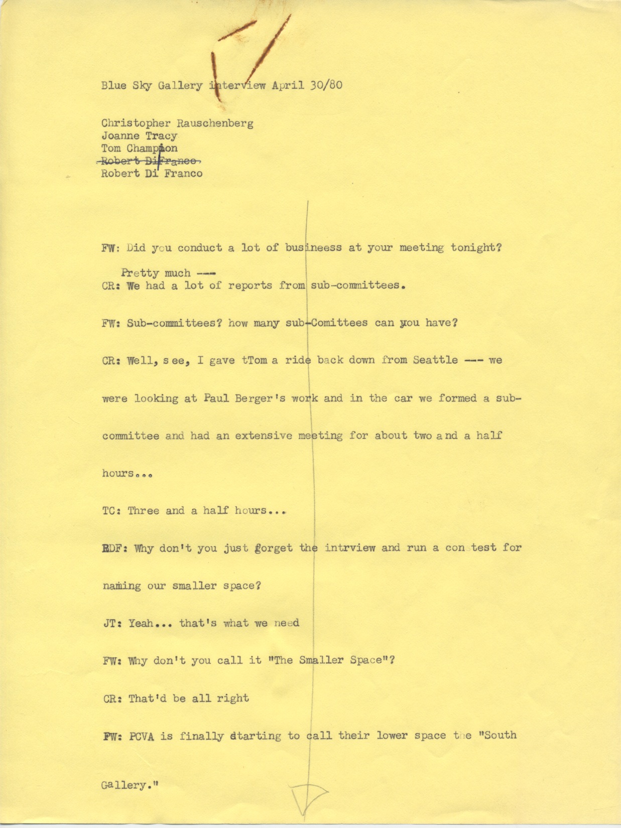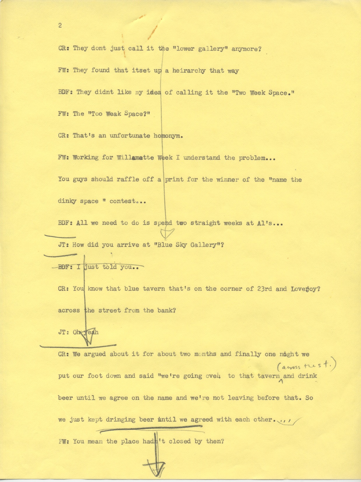 Recently, prompted by a Facebook post by Alberta Mayo, I was rummaging through my Blue Sky file, and I came upon the transcription of an interview that I taped on April 30, 1980 with some of the Blue Sky board. I was writing for Willamette Week and at the time the arts and entertainment section was called Fresh Weekly. So “FW” is Fresh Weekly. I don’t seem to have a published version of this. Here is is the direct transcript from the tape, done on my manual typewriter—Blue Sky thinking from almost 35 years ago.