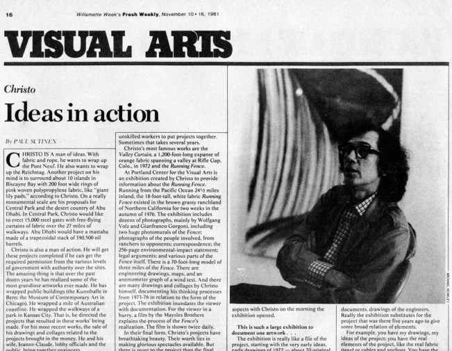 The passing of Christo June 1, 2020 by Paul Sutinen Christo died yesterday. Here’s an interview I did when his (and Jeanne-Claude’s) work was shown at Portland Center for the Visual Arts in 1981.